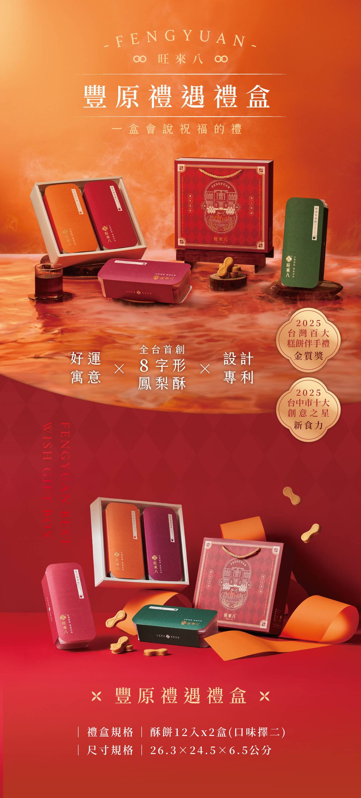 豐原禮遇禮盒(鳳梨酥12入x2款,共24入),鳳梨酥|旺來八。首創8字形鳳梨酥-旺來好運發,企業送禮,中秋禮盒,過年禮盒,最能表達心意。