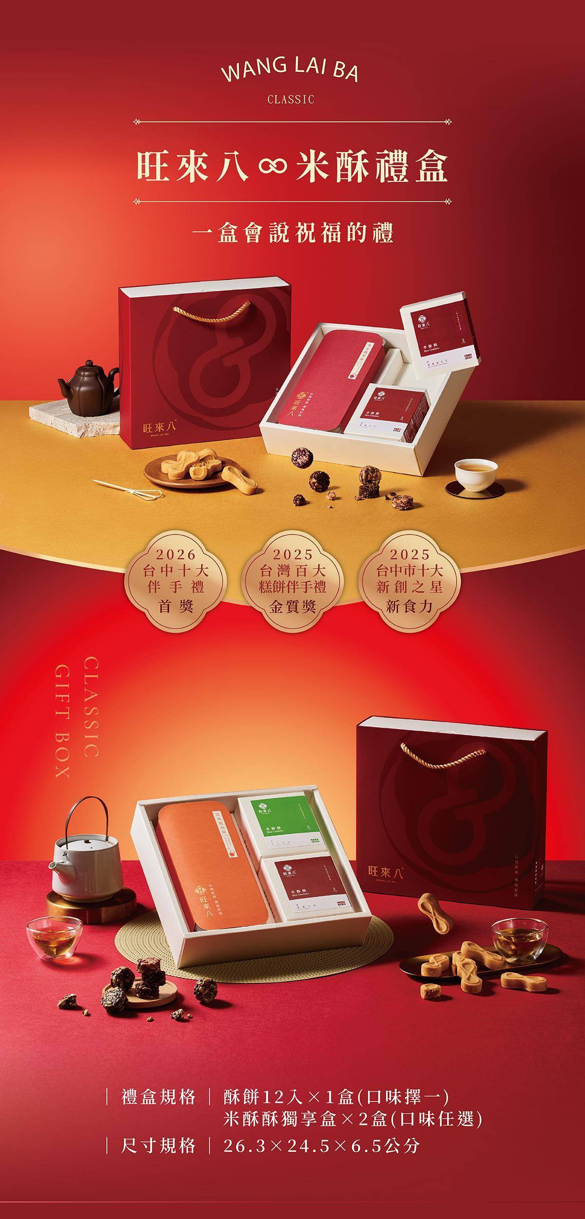 經典米酥禮盒(酥餅12入x1+米酥獨享盒2入/盒x2),鳳梨酥|旺來八|首創8字形鳳梨酥-旺來好運發,過年禮盒,台中十大伴手禮-首獎,企業送禮,中秋禮盒