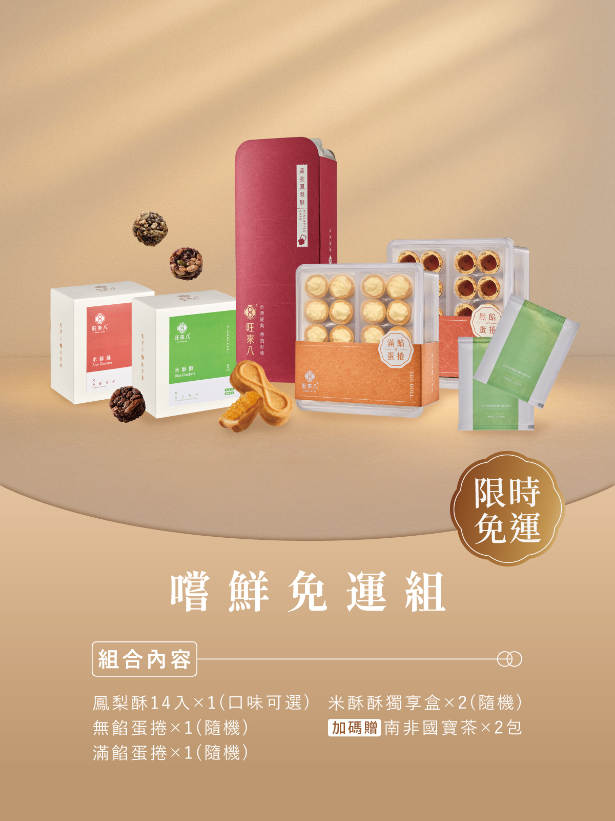 商品詳情 【限時免運】嚐鮮免運組(鳳梨酥14入*1+無餡蛋捲20入(隨機)*1+滿餡蛋捲20入(隨機)*1+米酥酥獨享盒2入(隨機)*2+贈國寶茶1包*2) TWD $1,665 ~ 1,685 TWD $1,080 ~ 1,100
